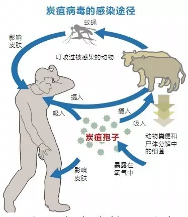 患病的牛、马、羊、骆驼等食草动物是人类炭疽的主要传染源。炭疽病人的分泌物和排泄物也具传染性。人感染炭疽杆菌主要通过皮肤直接接触病畜及其皮毛(特别是破损的皮肤);吸入带大量炭疽芽胞的尘埃、气溶胶;进食染菌肉类。可分别发生皮肤炭疽、肺炭疽、肠炭疽。